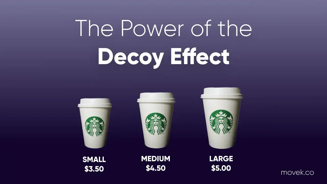 Coffee Shop Sizing: The classic example. A small at $2.50, a medium at $4.25, and a large at $4.50. The medium decoy makes the large feel like an irresistible bargain.