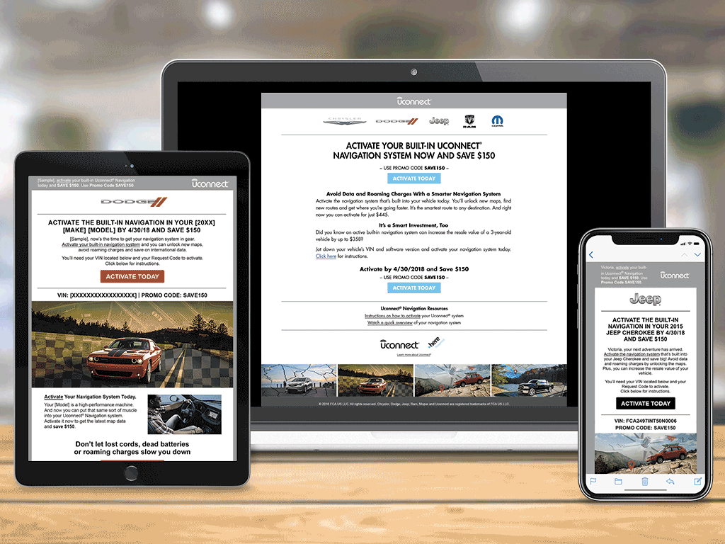 J&C used a personalized approach to appeal to drivers. The subject line of the email called out the recipient’s model while the header image had the car’s logo. Striking vehicle-specific images were created and overlaid with navigation imagery — highways, compasses, routes and dropped pins. Also, the copy highlighted what each driver loves about their car. It called out the muscle of their Ram, the family-friendly features of their Chrysler, the performance of their Dodge or the rugged adventures they take in their Jeep.
